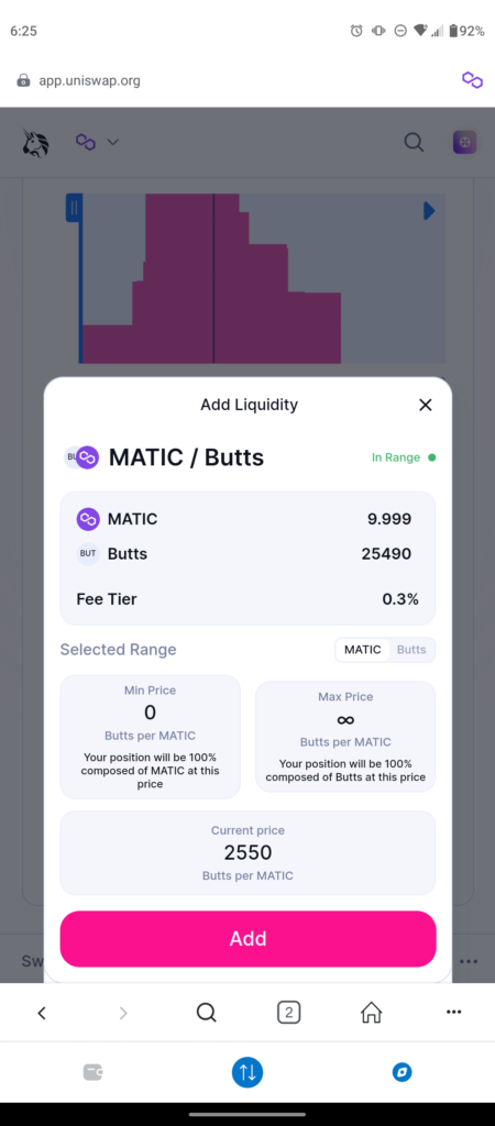 You can select the fee tier(although you should just choose 0.3%) as that’s the most common. You can also dictate price range, but I just maxed my range out by hitting full range below. Also below you will select how much matic and buttcoin to add.